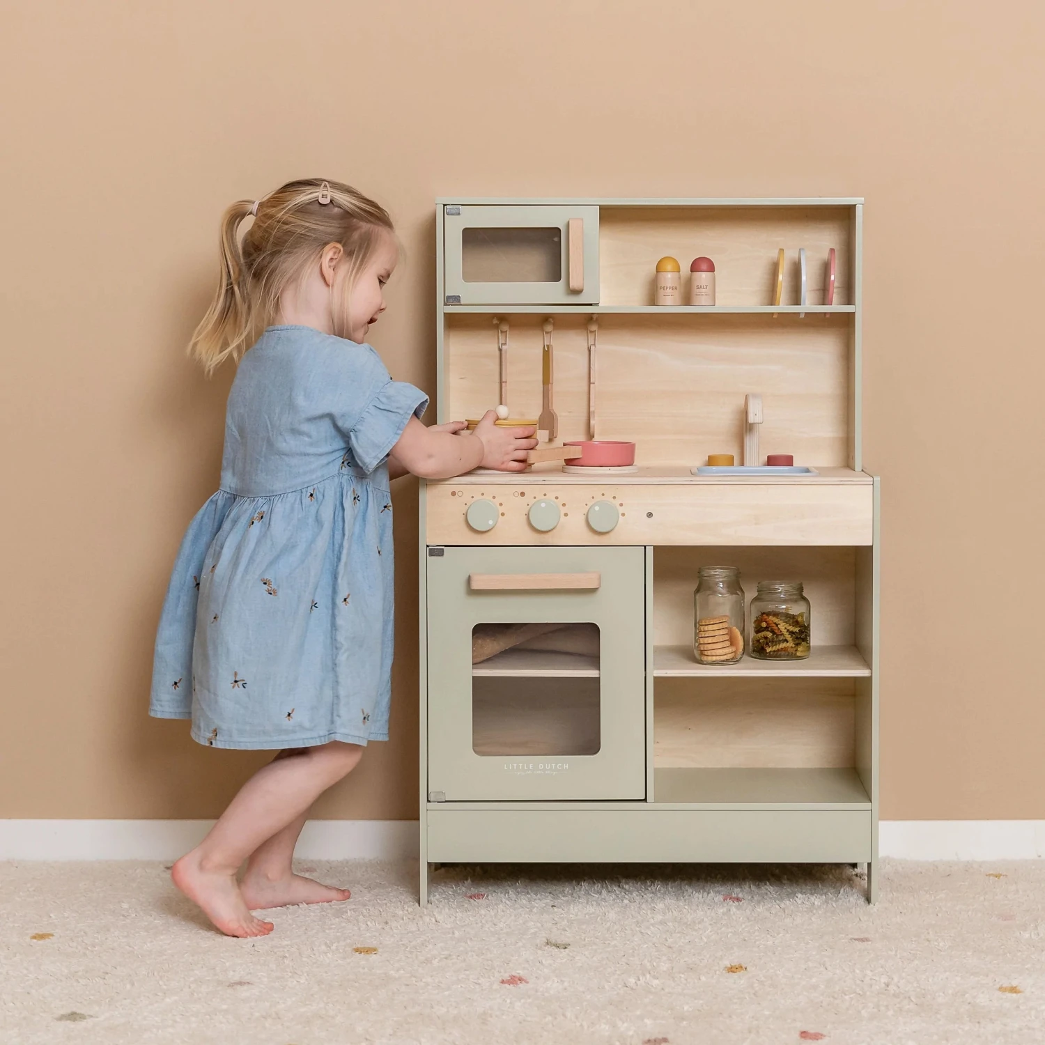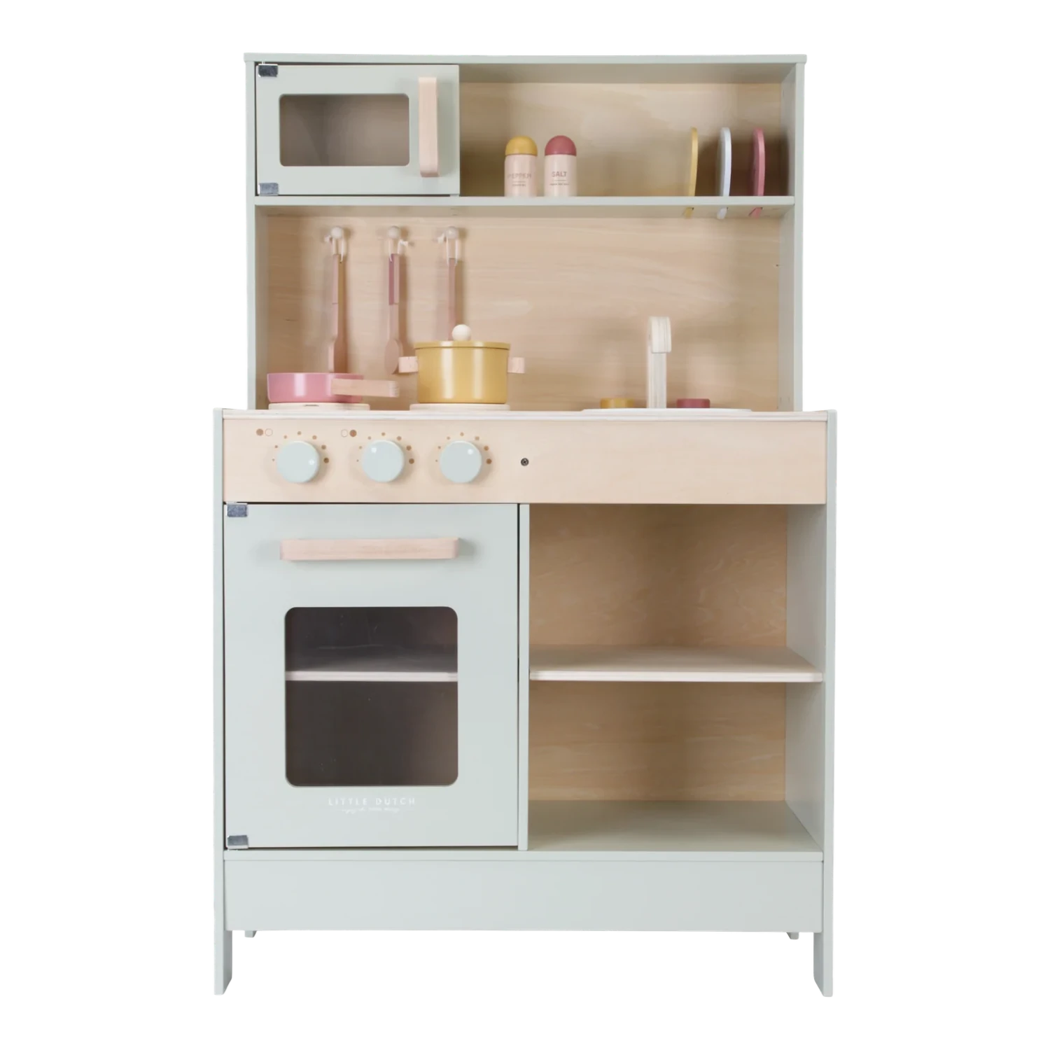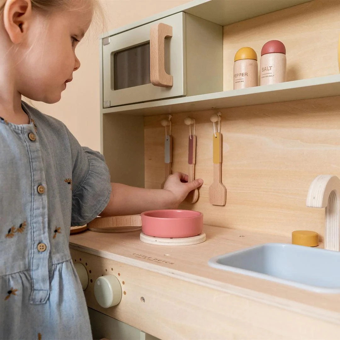 Introducing the Little Dutch Kitchen in Mint, a Scandi-style play kitchen that seamlessly blends into any living room or play corner. This delightful play kitchen encourages imaginative role-play, allowing children to create their own cafe, restaurant, or embark on culinary adventures for family, friends, and beloved teddies and dolls. Complete with two pans and kitchenware, this playset provides an engaging way for budding young chefs to practice important life skills by mimicking adult routines.