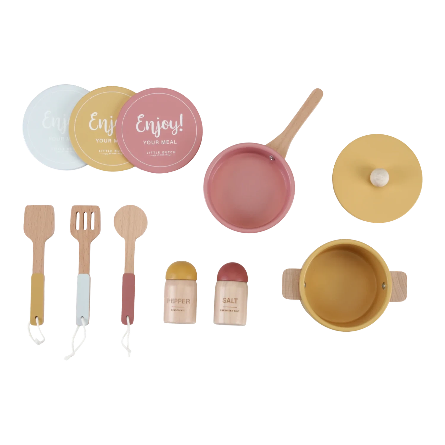 The set consists of 3x plates, 1x kitchen, 1x frying pan, 1x saucepan + lid, set of 3 hanging cooking utensils and a set of salt + pepper shakers.