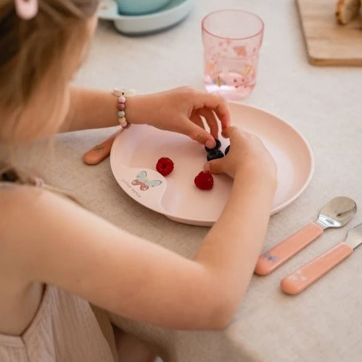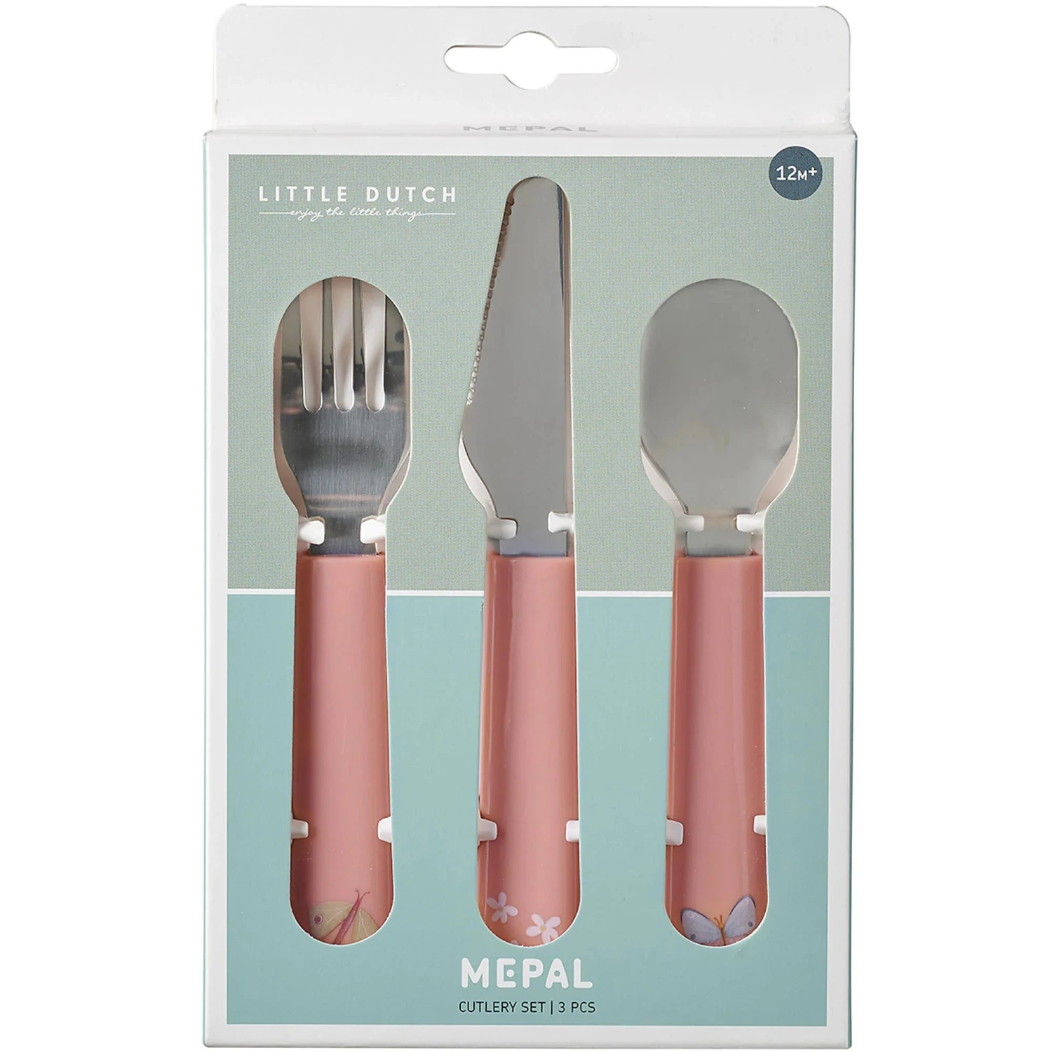 Cut, stir, poke and bite! This 3 pcs Mepal Mio cutlery set makes a great start for when your toddler is ready to self-feed. Thanks to the light pink colour and Flowers & Butterflies illustrations, everyone at the table knows who’s cutlery this is. The comfortable grips fit little hands perfectly and the fork and blade are designed to be safe for children from 12 months and older. Self-feeding is a big step in the development of your child. Picking up a spoon or fork develops hand-eye coordination, fine motor skills, and confidence too. So go ahead and taste those lovely flavours all on your own.