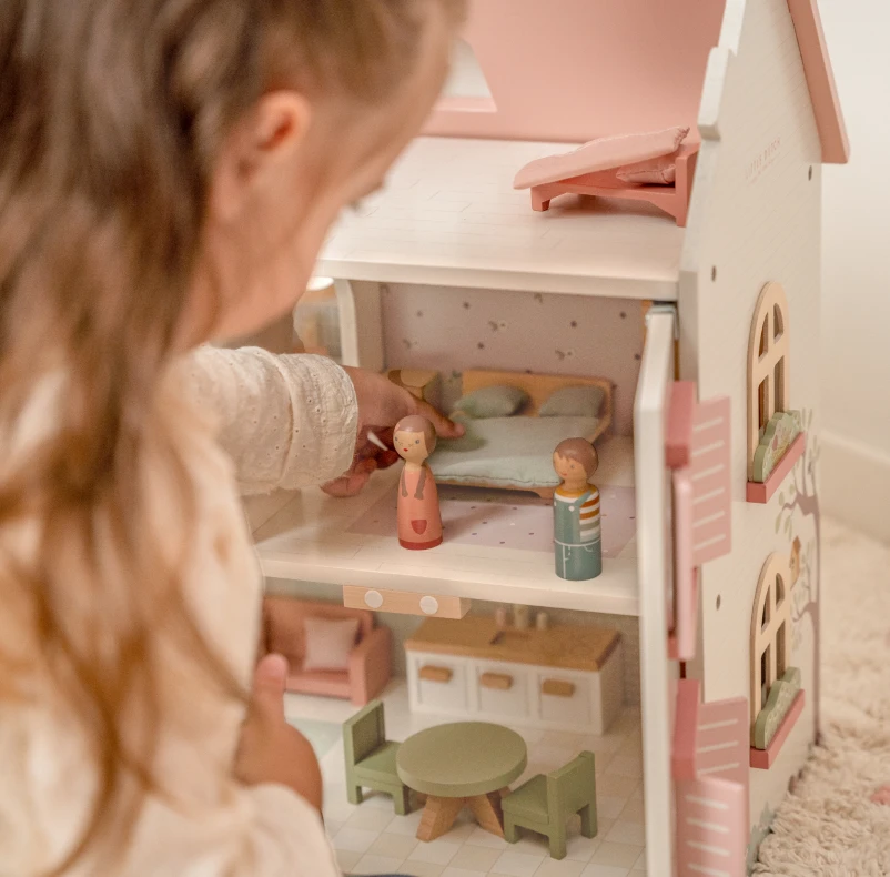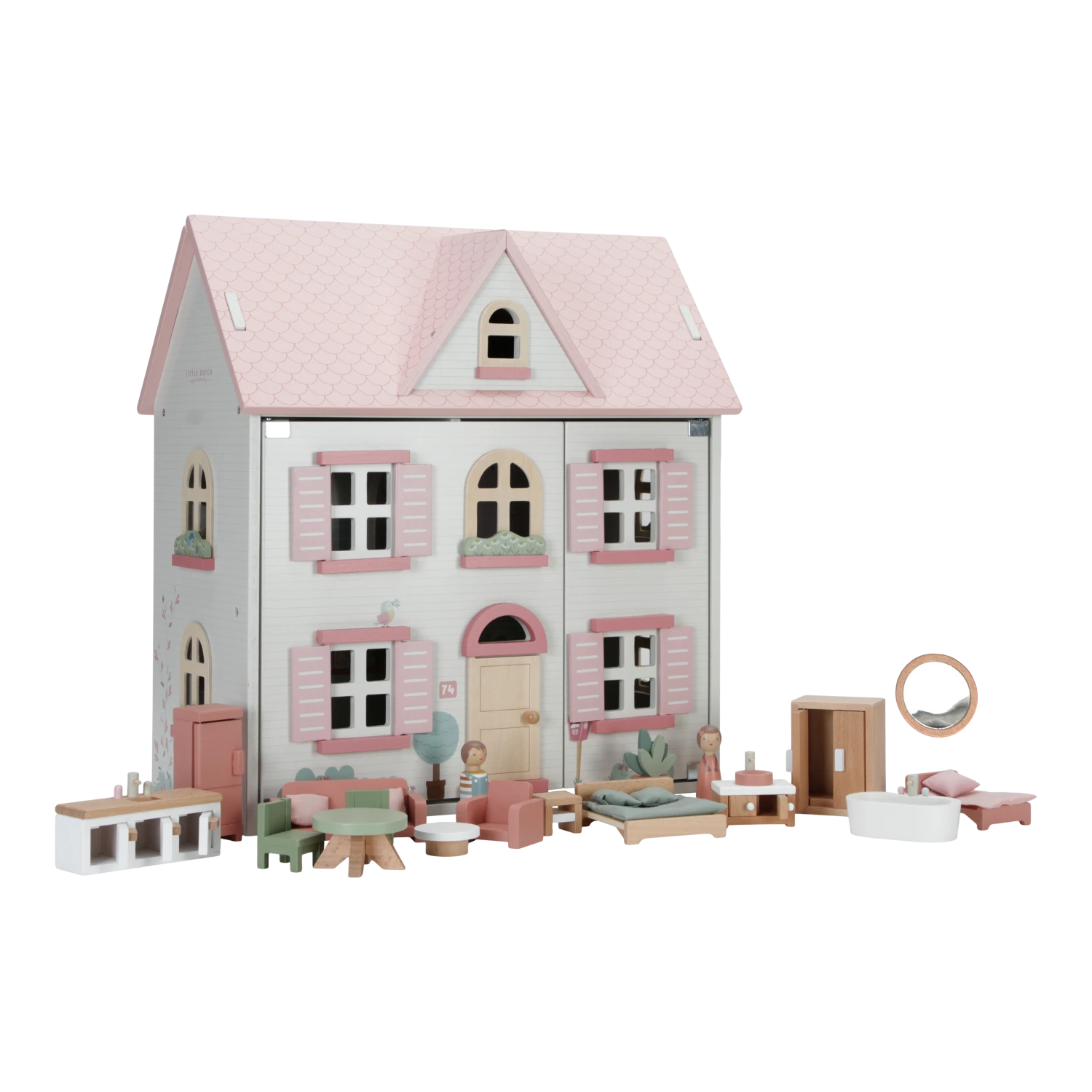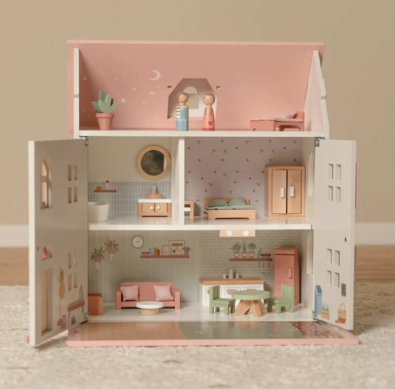 Unleash your little one’s creativity with the Pink Wooden Dolls House from Little Dutch. This charming miniature house, featuring a neutral white colorway and a delightful pink roof, provides endless imaginative possibilities. With wooden shutters that open and close, a removable roof that transforms into a garden scene, and beautifully illustrated rooms, including a living room, kitchen, bathroom, bedroom, and children’s room, this petite home is furnished with matching furniture and accessories, complete with Jim and Rose peg doll figurines. A perfect way for children to enjoy imaginative play and creativity.