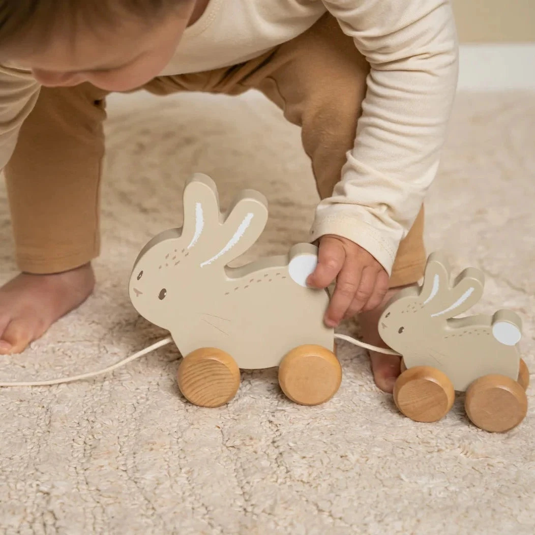 Meet the adventurous bunnies that love exploring the house with your little one! With a simple pull of the string, embark on exciting adventures together. Crafted from durable wood, these pull-along animals are always ready for play, encouraging your child to walk and supporting their motor development. The string has a functional length of approximately 50cm, ensuring endless fun and exploration.