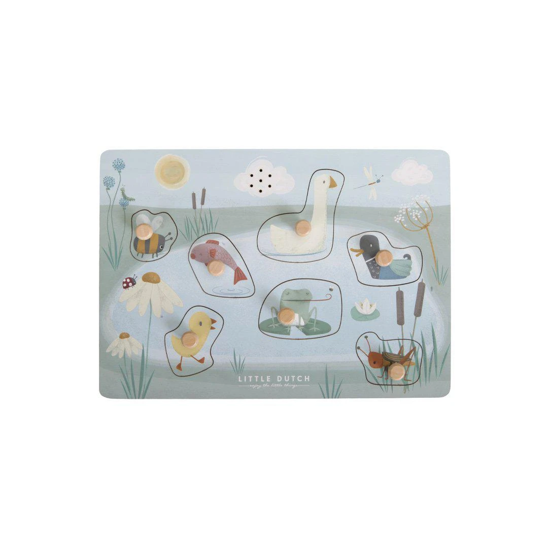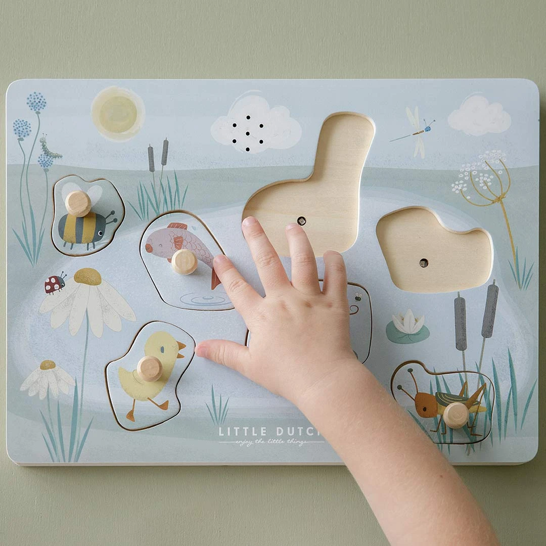 Designed for your child to explore the living creatures around the pond in the countryside. This lovely puzzle with 7 animals and sounds stimulates coordination and vocabulary.